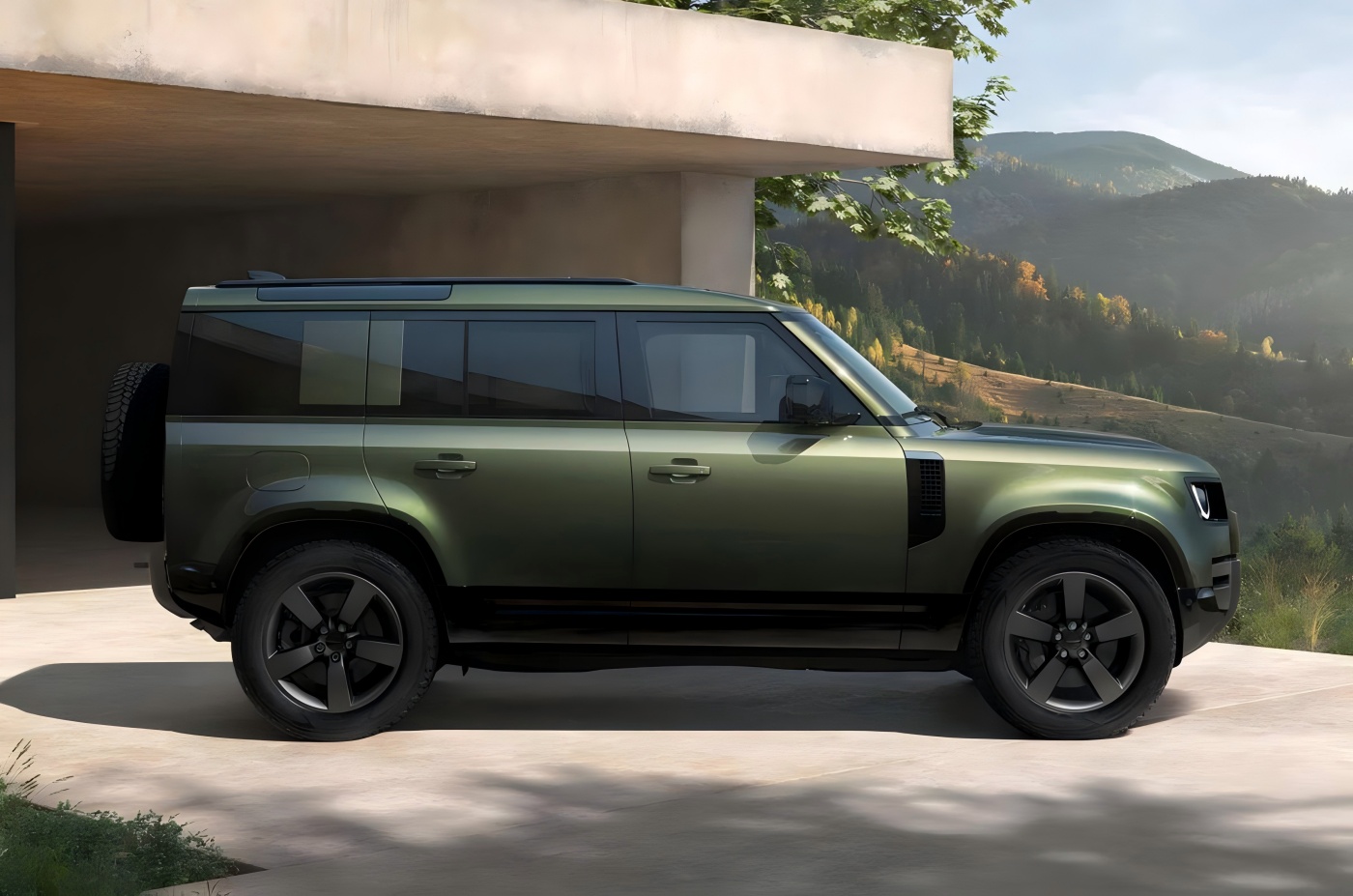 Страна. Поглед од страна, новото возило го продолжува класичниот стајлинг на дефанзивецот на Land Rover. 110 верзијата усвојува дизајн со четири врати, во кој има широки предни и задни странични браници, заедно со тркала со пет збирки и дебеломер со мулти-клипни сопирачки. Димензиите на телото остануваат непроменети, со должина, ширина и висина од 5018/2105/1967 мм, соодветно, и меѓуоскино растојание од 3022 мм.